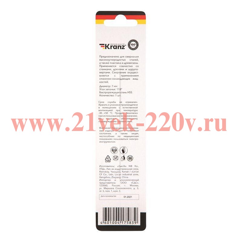 Сверло KRANZ изготовлено по стандарту DIN 338 и используется для сверления отверстий в таких материалах, как сталь, дерево и пластик.
