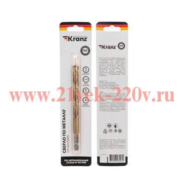 Сверло по металлу, 9мм, Р6М5, ТИТАН, шестигранный хвостовик (1 шт. в упаковке) DIN 338 KRANZ Сверло по металлу KRANZ предназначено для сверления отверстий в нержавеющей и жаростойкой стали, легированной и нелегированной стали, сером чугуне, стальном литье, цветных металлах и твердой пластмассе. Используется совместно с дрелью. Изделие выполнено из качественной быстрорежущей стали Р6М5, что обеспечивает долгий ресурс работы, высокую производительность, устойчивость к перегреву и высоким нагрузкам. Сверло обладает пониженным коэффициентом трения и обеспечивает эффективный отвод стружки. Рабочая часть инструмента позволяет быстро и надежно сверлить металл, гарантирует ровные и аккуратные отверстия. Заточка режущей части под углом 135 градусов способствует эффективному входу в материал. Покрытие из нитрид-титана предотвращает образование коррозии и преждевременный износ инструмента. Шестигранный хвостовик исключает проворачивание в зажимных патронах. Ресурс использования заметно увеличивается при использовании СОЖ.