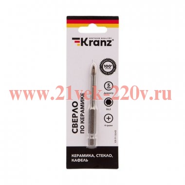 Сверло по стеклу и керамике 5мм 4 грани шестигранный хвостовик Kranz KR-91-0648
