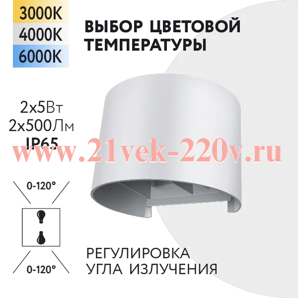 Светильник светодиодный настенный FL-LED WallBarrel-UD006R 2x5W-UP/DN 0-120° CCT-3000K+4000K+6000K 140x120x100мм WT IP65 мощностью 2x5 Ватт со степенью защиты IP65 .