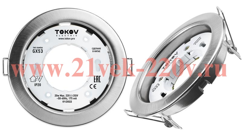 Встраиваемые светильники под лампу GX53 товарного знака Tokov Electric предназначены для общего и акцентного освещения жилых, административно-общественных и производственных помещений и рассчитаны для работы в сети переменного тока с номинальным напряжением 230 В и частотой 50 Гц.