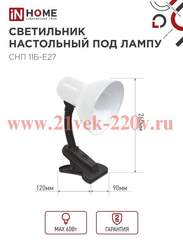 Светильник настольный под лампу на прищепке СНП 11Б-E27 бел. (коробка) IN HOME