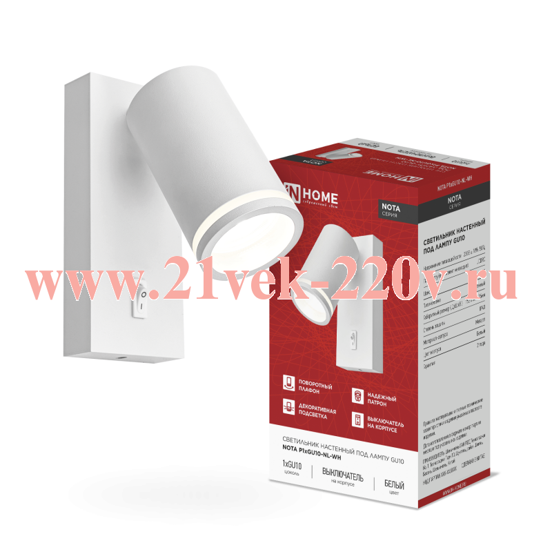 Светильник NOTA P1хGU10-NL-WH настен. под лампу с выключателем бел. IN HOME