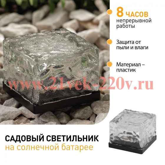 Уличный садовый светильник ERASF024-20 "Ледяной куб" предназначен для подсветки растений в саду, декоративного прудика, аллеи или входа в дом. Особенно эффектно подсветка смотрится в ступеньках или парковых дорожках. Модель имеет габариты 8х8х7 см и с легкостью устанавливается в землю. Комплект состоит из одного кубика. Садовый светильник работает на солнечной батарее. Такой тип получения энергии является самым экологичным, энергоемким, а также бесшумным. Питание происходит во включенном режиме, днем. Самое интересное начинается после захода солнца. Маленькие фигурки освещают территорию вокруг холодным заливным белым светом. Необычная отделка корпуса придает светильнику причудливый стиль, добавляет свежести и динамики пространству. Солнечная батарея рассчитана на 8 часов непрерывной работы. Высокая степень защиты от пыли и влаги позволяет оставлять садовый светильник на улице даже во время дождя. Перед использованием внимательно изучите инструкцию. Обращаем Ваше внимание, что перед использованием фигурки её необходимо включить и зарядить. Светильник заряжается в течение всего светового дня. Декоративная подсветка ERASF024-20 "Ледяной куб" от бренда ЭРА свежий вариант для преображения сада.