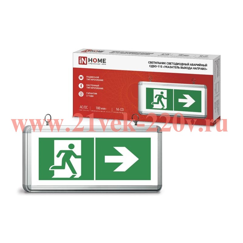 СДБО-115 "УКАЗАТЕЛЬ ВЫХОДА НАПРАВО" ТМ IN HOME – это односторонний аварийный светильник (указатель) на сверхъярких светодиодах в корпусе из прочного алюминия. Его основное предназначение – обеспечение эвакуационного освещения в случае аварии или пожара. Может устанавливаться в жилых, общественных, производственных помещениях (при температуре от +1 до +40°C). Может работать как от электросети, так и от встроенного никель-кадмиевого аккумулятора (время зарядки 24-48 часов). Способен функционировать в автономном режиме в течение 180 минут. Обладает встроенной защитой от разрядки аккумулятора. Устанавливается настенным (накладным), либо подвесным способом (на подвес при помощи монтажных колец, входящих в комплект). Срок службы – 30 000 часов. Гарантия – 2 года.