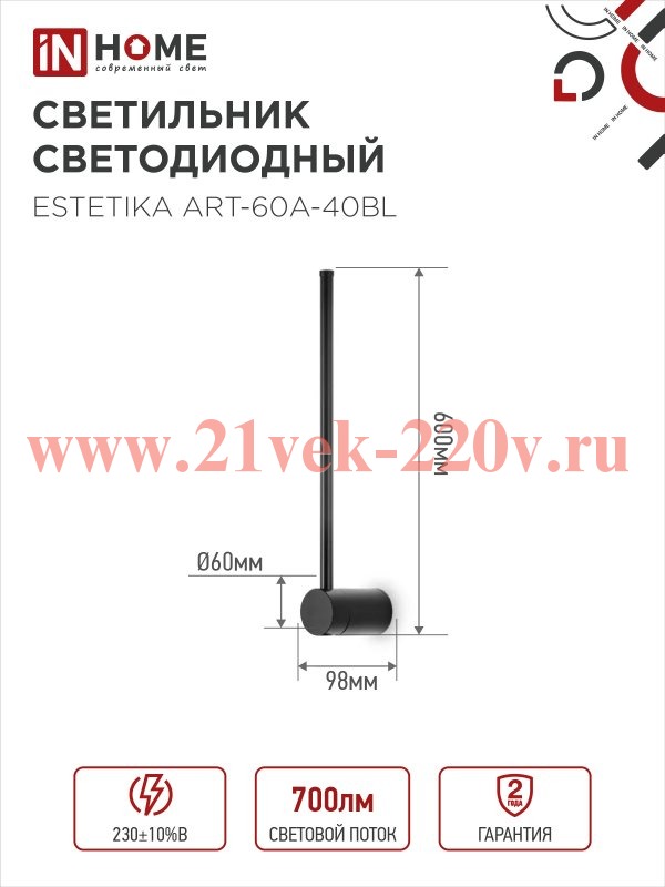 Светильник светодиодный ESTETIKA ART-60A-40BL 10Вт 230В 4000К 700лм 600х60х98 черн. IN HOME