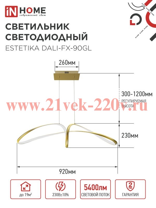 Светильник светодиодный ESTETIKA DALI-Fх-90GL 90Вт 3000-6500К 230В 920х245х230мм 1.2м трос ДУ зол.