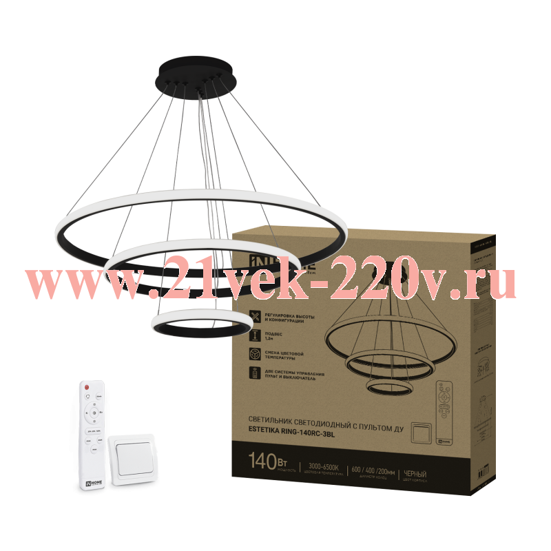 Светильник светодиодный ESTETIKA RING-140RC-3BL 140Вт 3000-6500К 230В 600/400/200 1.2м трос пульт ДУ