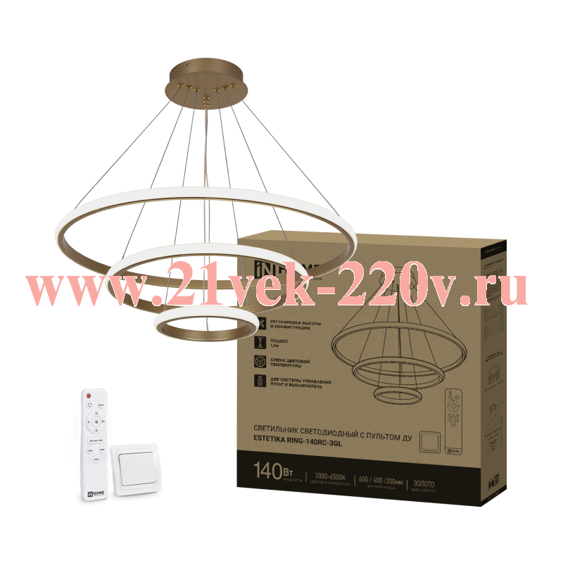 Светильник светодиодный ESTETIKA RING-140RC-3GL 140Вт 3000-6500К 230В 600/400/200 1.2м трос пульт ДУ