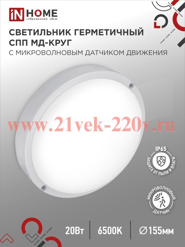 Светильник светодиодный герметичный СПП МД-2065-КРУГ 20Вт 6500К 1800лм IP65 155ммс микроволновым датчиком движения