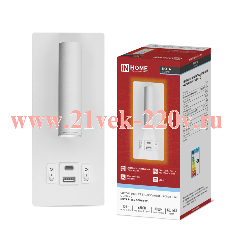 Светильник светодиодный NOTA P1565-30USB-WH 15Вт 6500К с подсветкой 3000К USB type C бел. IN HOME
