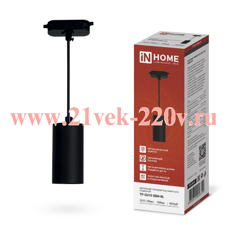 Светильник трековый подвесной TP-GU10 SBM-BL 100мм шнур 1м черн. IN HOME