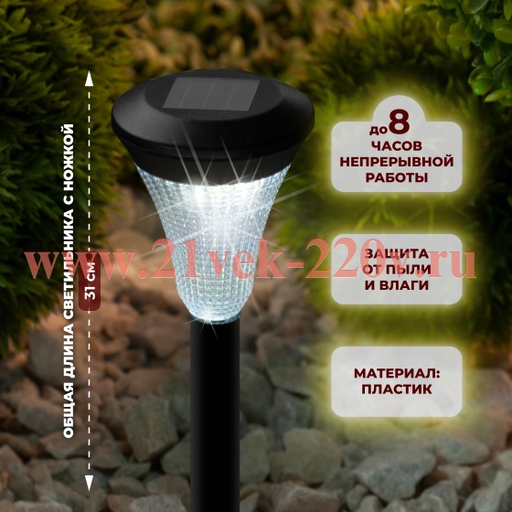 Классическая пластиковая модель садового светильника. Рифленое стекло плафона обеспечивает оригинальное свечение и красивые блики на освещаемой поверхности. Соотношение привлекательного дизайна и скромной цены обеспечивает стабильный спрос от сезона к сезону.