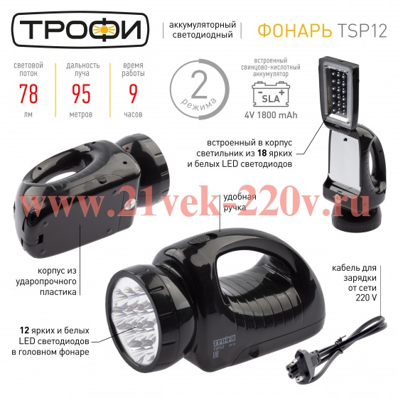 ТРОФИ TSP12 Фонарь Акку 4V1.8Ah, 12+18xLED, ЗУ 220V