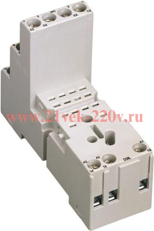Клеммы для подключения катушки (A1-A2) расположены в нижней части розетки, а все контакты (общие, н.о., н.з.) расположены в верхней части.