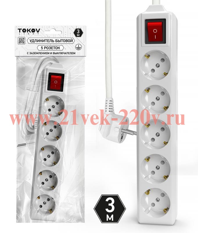 Удлинитель 5х3м с заземл. с выкл. 10А 3х1.5 TOKOV LIGHT TKL-C01-BU5-3-1.5-ZV