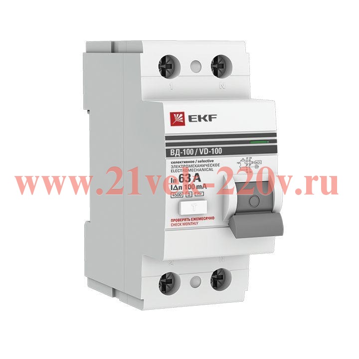 Устройство защитного отключения селективное 2P 63А/100мА (электромеханическое) EKF PROxima. Устройство защитного отключения УЗО ВД-100 EKF PROxima – это новое поколение устройств. Предназначены для защиты человека от поражения электрическим током при прикосновении к открытой проводке или электрооборудованию, оказавшемуся под напряжением, и для предотвращения возгорания, возникающего вследствие длительного протекания токов утечки и развивающихся из них токов короткого замыкания. Для защиты потребителей от токов перегрузки и короткого замыкания необходимо использовать УЗО совместно с автоматическими выключателями. Возможность работы при -25 °С. Наличие селективного исполнения. ПРИМЕНЕНИЕ: Защита людей от поражения электрическим током при случайном прикосновении к открытым проводящим частям электроустановки. • Защита электрооборудования (ЭО) при повреждении изоляции проводников и неисправностях ЭО. • Предотвращение возгораний и пожаров, возникающих вследствие протекания токов утечки и развивающихся из них коротких замыканий, замыканий на корпус и замыканий на землю. • УЗО тип А применяется в зданиях и жилых помещениях, насыщенных бытовой электронной техникой (телевизоры, персональные компьютеры, регулируемые источники света, современные стиральные машины и др.).