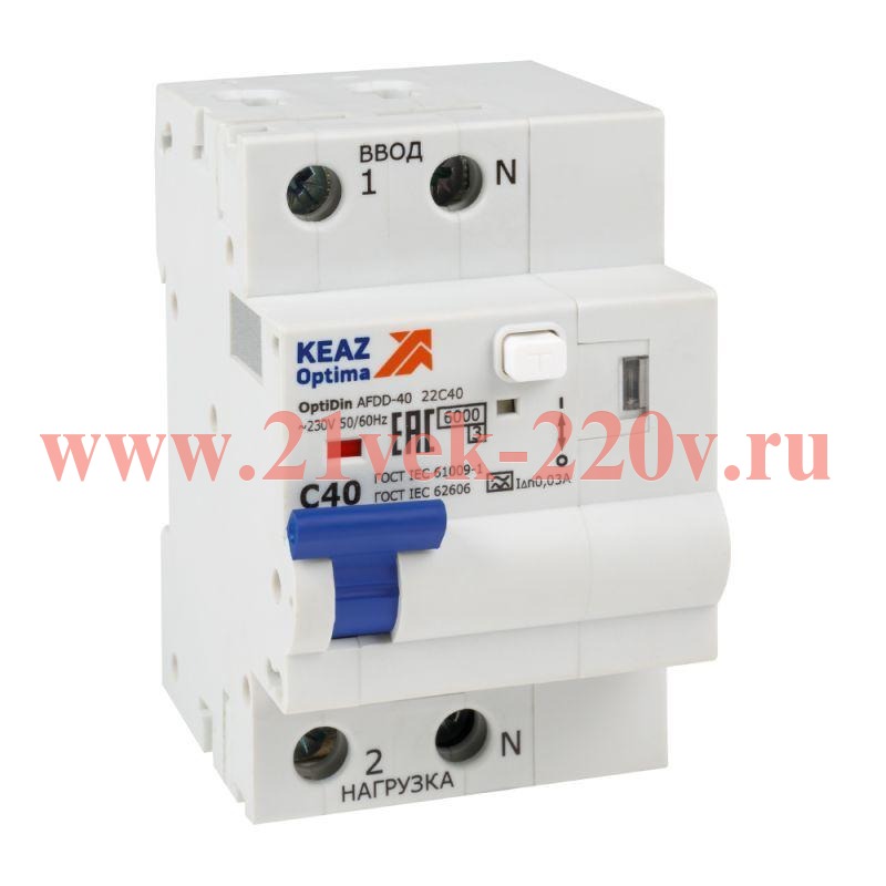 Устройство защиты от дугового пробоя с АВДТ и защитой от повышенного напряжения на номинальный ток 40 A и номинальный отключающий дифференциальный ток 100 мА.