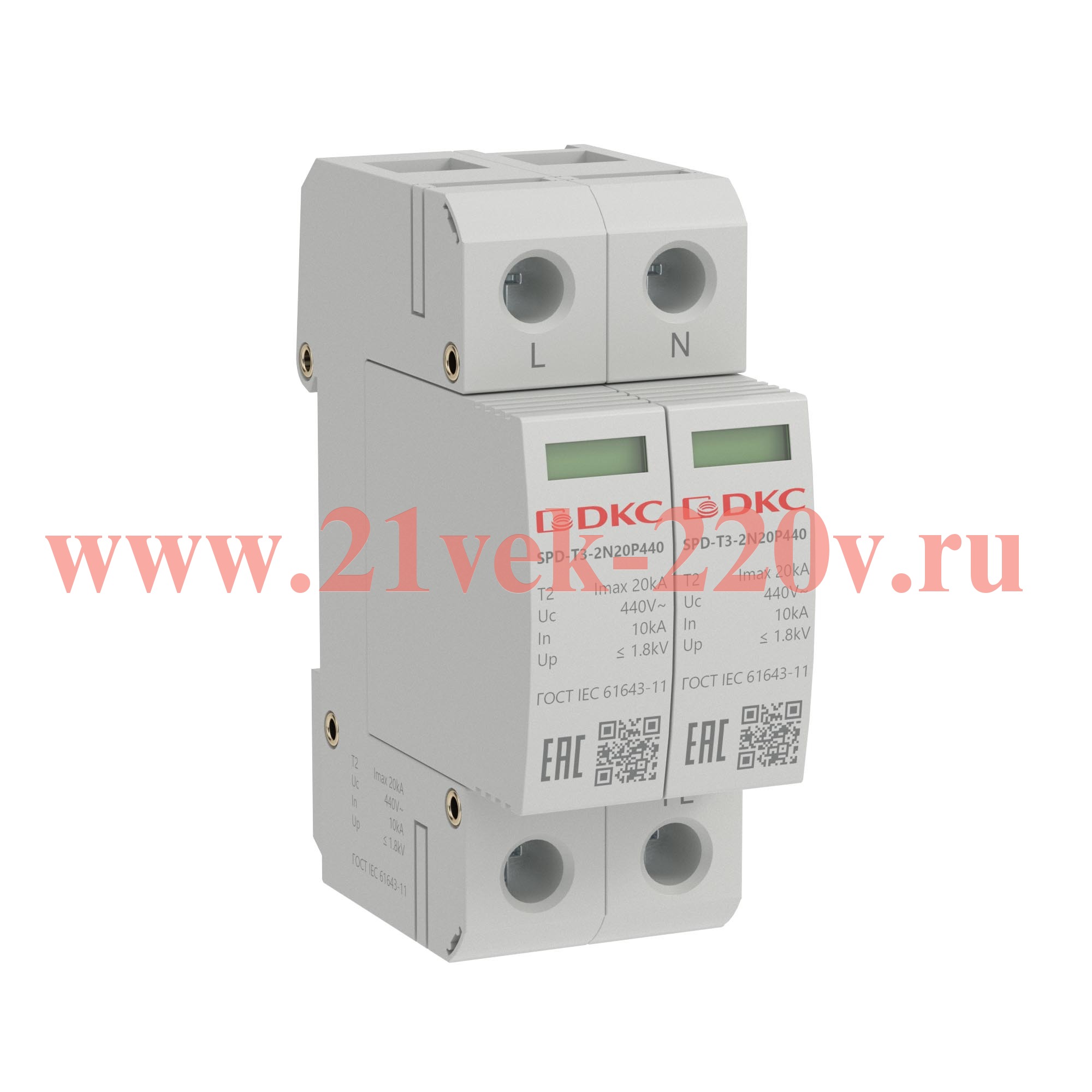 УЗИП, тип 3, 2 полюса, Imax 20kA, со сменным модулем, Un 440V