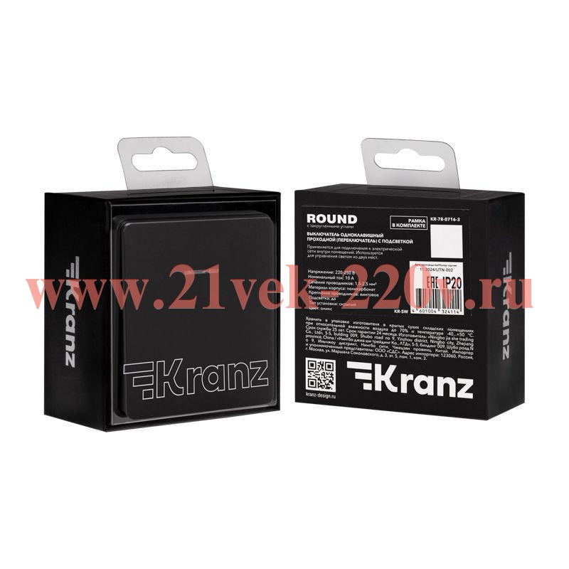 Выключатель 1-кл. СП ROUND MIELE 10А проходной переключатель с подсветкой оникс Kranz KR-78-0716-3