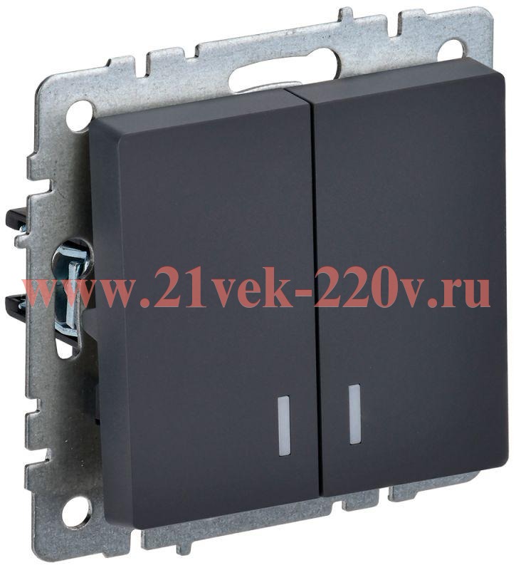 Механизм двухклавишного выключателя для скрытого монтажа IEK BRITE с клавишами графитового цвета и индикацией. BR-V20-1-10-K53