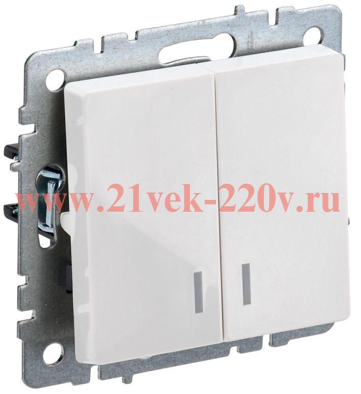 Механизм двухклавишного выключателя для скрытого монтажа IEK BRITE с клавишами белого цвета и индикацией. BR-V20-1-10-K01