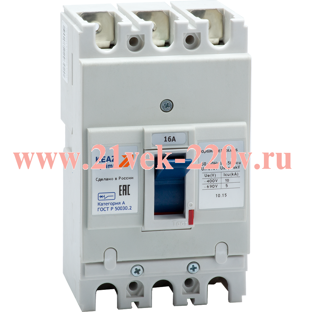 Силовой 3 полюсный автоматический выключатель переменного тока в литом корпусе на номинальный ток 16 А. Серия автоматических выключателей в литом корпусе OptiMat E – это надежные и простые в использовании защитные устройства, предназначенные для применения в распределительных системах низкого напряжения, для проведения тока в нормальном режиме и отключения тока при коротких замыканиях, перегрузках, а также до 30 оперативных включений и отключений электрических цепей в сутки. Выключатели с приемкой Российского морского регистра судоходства (далее РС) и приёмкой Российского речного регистра (далее РРР) предназначены для защиты судового электрооборудования и портовой инфраструктуры. Выключатели с приемкой АЭС предназначены для защиты атомных электростанций.