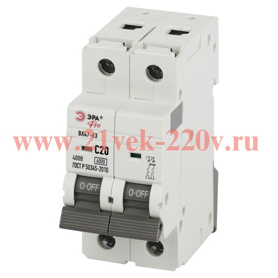 Автоматический выключатель ЭРА PRO VA63-2P20C6 ВА47-63 2P 20А кривая C 6кА