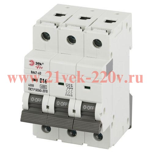 Автоматический выключатель ЭРА PRO VA63-3P16D6 ВА47-63 3P 16А кривая D 6кА