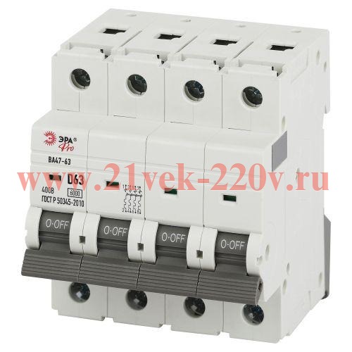 Автоматический выключатель ЭРА PRO VA63-4P63D6 ВА47-63 4P 63А кривая D 6кА