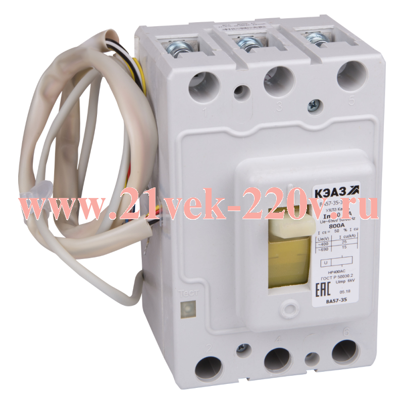 Трехполюсные автоматические выключатели КЭАЗ серии ВА57-35 предназначены для применения в электрических цепях с напряжением 400 / 690 В переменного тока частотой 50 и 60 Гц и 110 / 220 / 440 В постоянного тока, их защиты от токов короткого замыкания, токов перегрузки, недопустимых снижений напряжения, а также для нечастых оперативных включений и отключений.