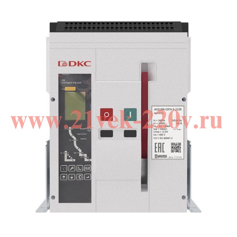 Воздушный автоматический выключатель YON AGS16N 3Р 1600 А 65 кА, типоразмер S, расцепитель 3M, фиксированный, управление 220 В AC, горизонтальное подключение