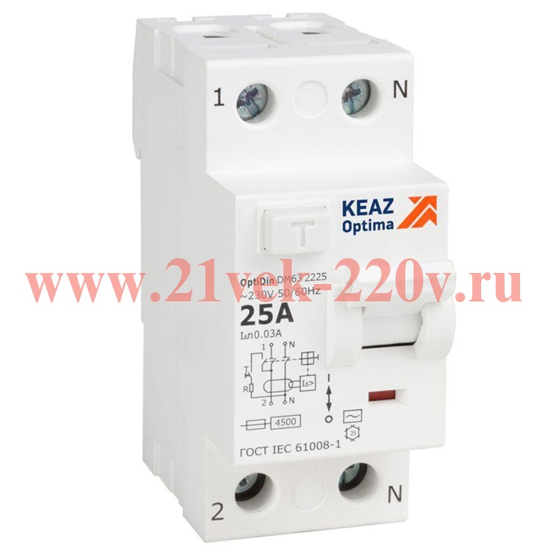 Выключатель дифференциального тока (УЗО) 2п 25А 10мА тип AC 4.5кА OptiDin DM63-2125 УХЛ4 КЭАЗ