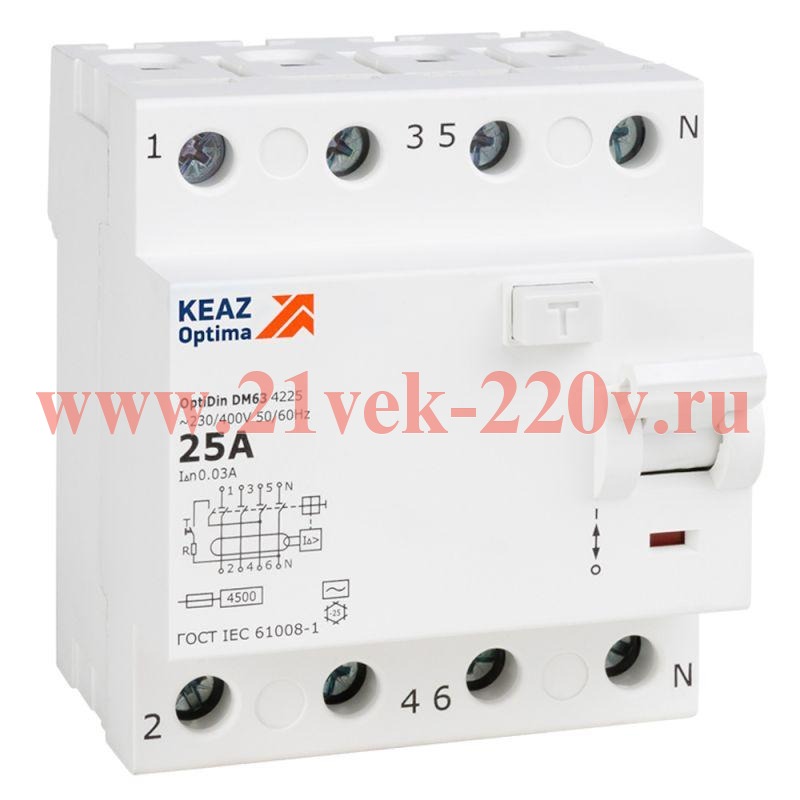 Выключатель дифференциального тока (УЗО) 4п 25А 300мА тип AC 4.5кА OptiDin DM63-4425 УХЛ4 КЭАЗ
