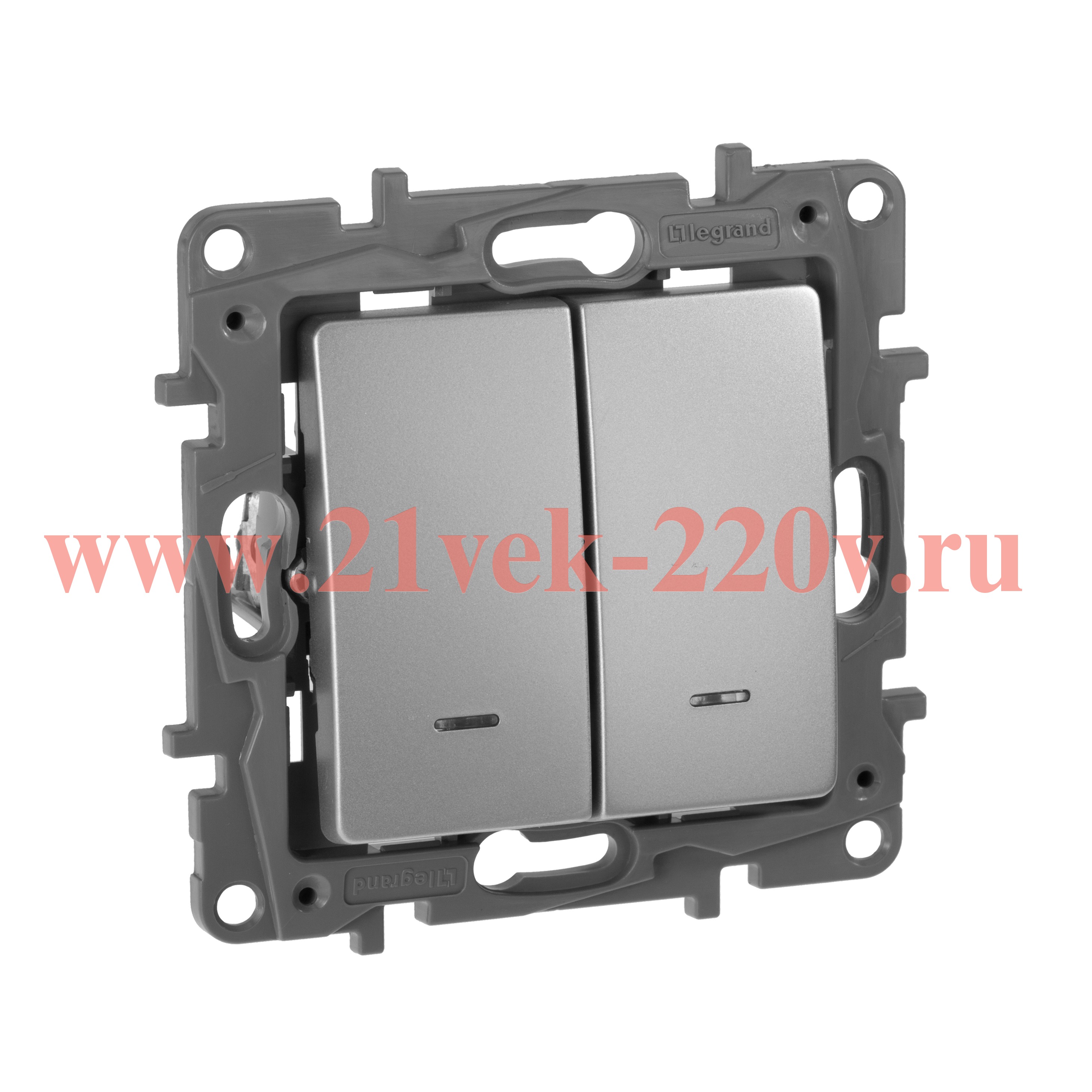 Двухклавишный выключатель c подсветкой,самозажимные клеммы (672404) Легранд (Legrand) серии Этика (Etika). Цвет - алюминий.