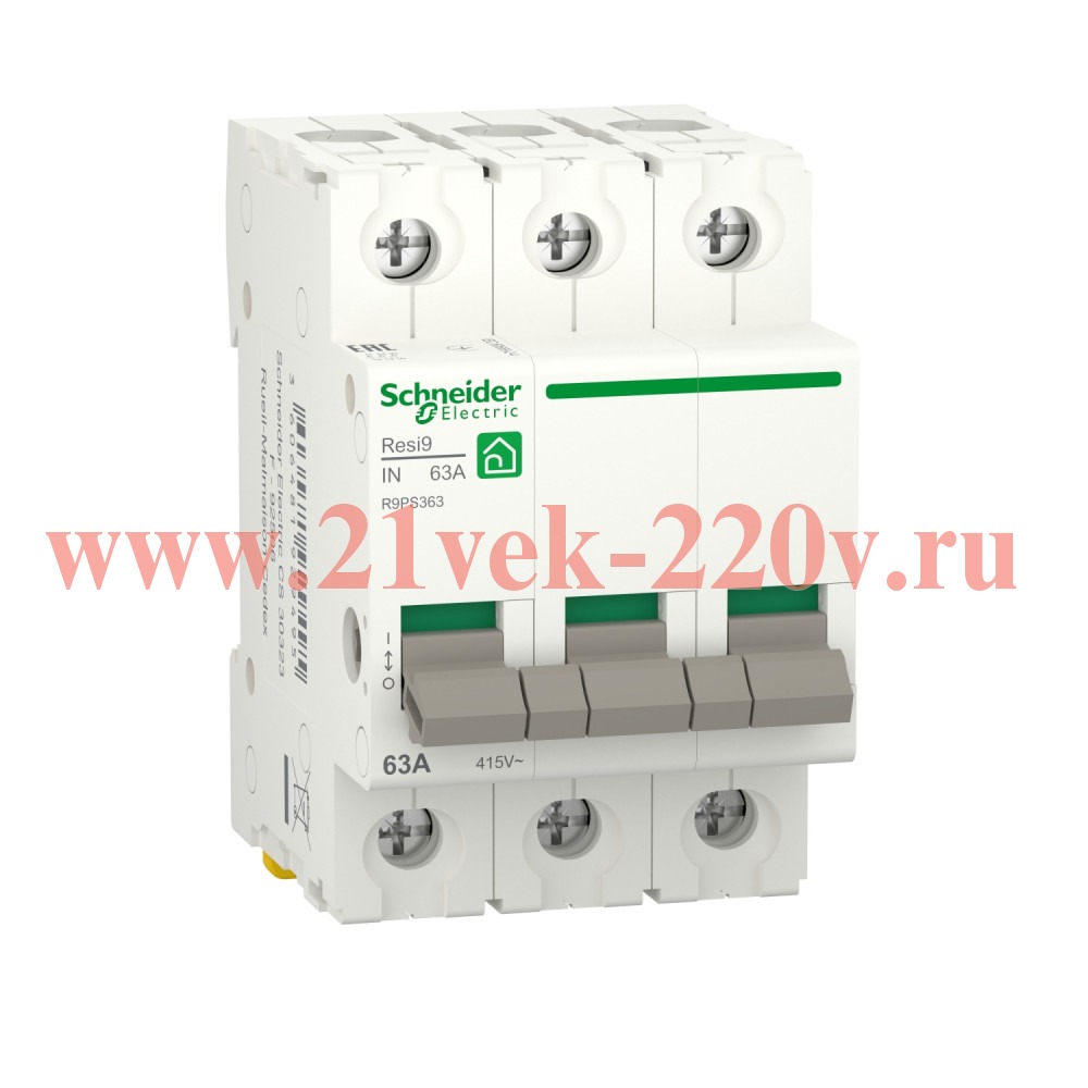 Компактный выключатель нагрузки от известной торговой марки Schneider Electric относится к серии рубильников модульного типа Resi9 и представляет собой трехполюсный агрегат для включения и отключения электрических цепей под нагрузкой. Благодаря своей миниатюрной конструкции шириной в 3 модуля он устанавливается на DIN-рейку методом простого защелкивания. Его областью применения выступают распределительные щиты жилищного сектора и небольших коммерческих объектов. Рубильник этой линейки сочетает в себе надежность и безопасность и рассчитан на рабочий ток 63 Ампера при предельном напряжении сети 415 Вольт переменного тока. Его номинальная отключающая способность составляет 6 кАмпер. Корпус аппарата выполнен в белом цвете и обладает степенью защиты IP20 при монтаже на открытом пространстве, после установки в шкафу степень защиты соответствует IP40. На рубильнике присутствует рукоятка управления для его ручного включения или отключения. Она сделана в сером цвете и обладает индикацией положения. Подключение устройства возможно сверху или снизу только медными проводниками: жестким с сечением до 50 квмм, гибким или гибким с наконечниками до 35 квмм.Размеры рубильника:ширина – 54 мм;высота – 81 мм;глубина – 76 мм;вес – 232 г.Уважаемые покупатели! На сайте указана розничная цена!!! По оптовым ценам и скидкам уточняйте у наших менеджеров по телефону 8(499)213-00-79. Также вы можете ознакомиться с этой информацией в прайс-листах.