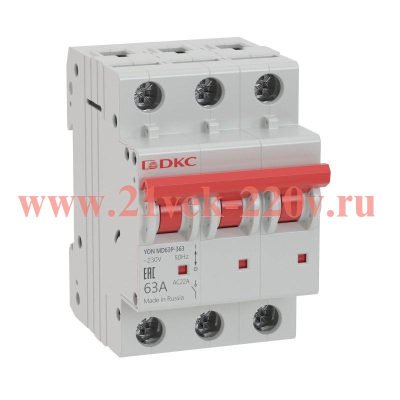 Модульный трехполюсный выключатель нагрузки YON MD63P номиналом 63 A предназначен для применения в электрических цепях напряжением до 400 В переменного тока частоты 50 Гц, проведения тока в нормальном режиме и оперативного включения и отключения указанных цепей.