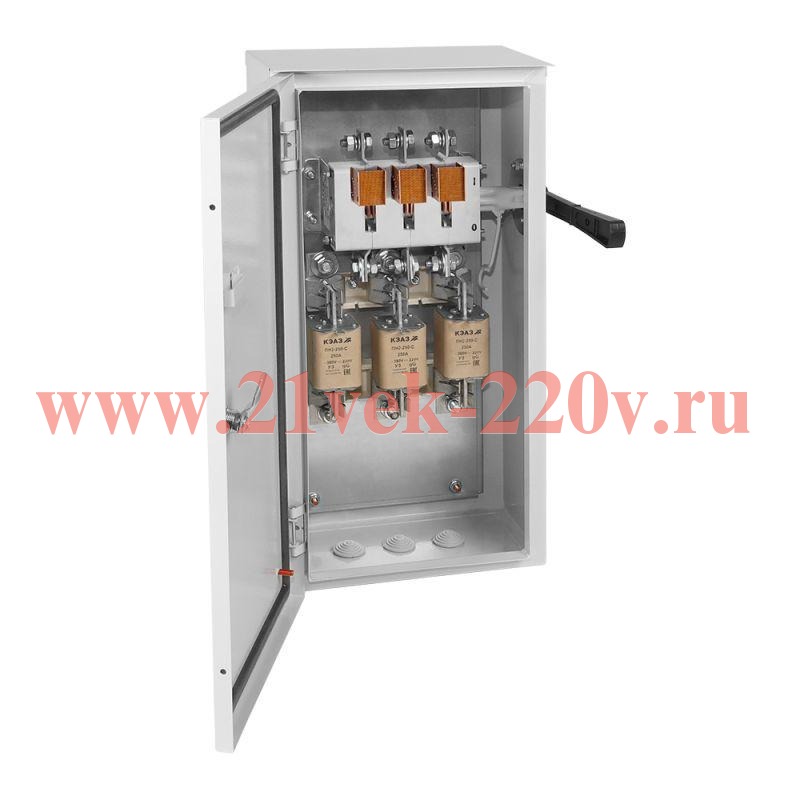 Ящик силовой типа ЯРВ в комплекте с предохранителями на номинальный ток 400 А. Шкаф изготовлен с применением выключателей-разъединителей серии ВР32 на одно направление и предохранителей серии ПН2. Съемная ручка ВР32 поставляется в комплекте. Включение выключателя-разъединителя блокирует дверь шкафа. Открытие двери возможно только при отключении выключателя-разъединителя. Оболочка навесного типа со степенью защиты IP54. Цвет: RAL7035 (порошковая окраска).