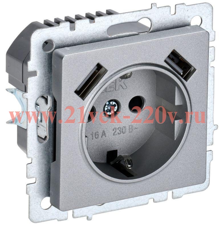 Механизм электрической розетки немецкого стандарта с защитными шторками, двумя разъемами USB type A 2100мА и лицевой панелью цвета алюминий для скрытого монтажа, IEK BRITE. BR-R14-16-U21-D21-K47