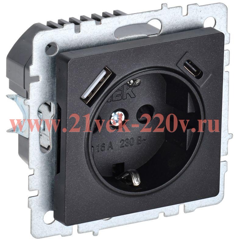 Механизм комбинированной электрической розетки немецкого стандарта с защитными шторками и зарядкой USB type A+С 3100мА, лицевая панель черного цвета, для скрытого монтажа, IEK BRITE. BR-R14-16-U22-018-K02