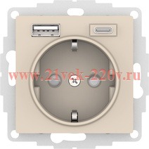 Розетка силовая Шнайдер Электрик Атлас Дизайн с заземлением и шторками, два USB с разъема типа А и С, скрытого монтажа, цвет бежевый