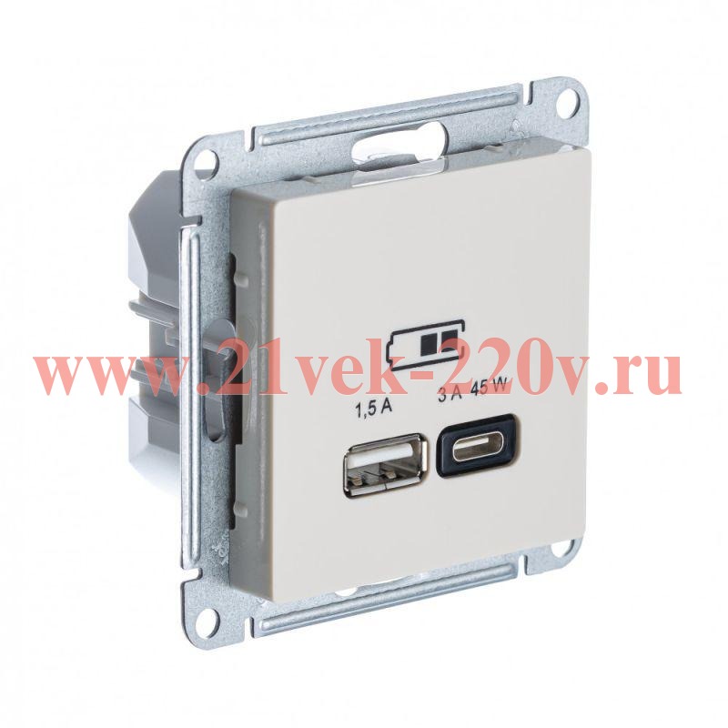 Быстрое зарядное устройство Атлас Дизайн, два USB с разъема типа А и С мощностью до 45 Вт, скрытого монтажа, цвет бежевый ATN000229