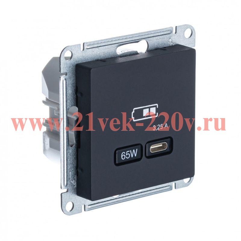 Быстрое зарядное устройство Шнайдер Электрик Атлас Дизайн, USB разъем типа С мощностью 65 Вт, скрытого монтажа, цвет карбон