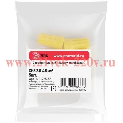 Соединительный изолирующий зажим ЭРА NO-225-55 СИЗ-4 (2,5-4,5 мм2) жёлтый (упак. 5 шт.)