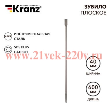 Зубило плоское 14х20х600мм, SDS PLUS KRANZ Плоское зубило с широкой рабочей поверхностью предназначено для демонтажа и дробления твердых материалов: камня, бетона, кирпича, плитки, штукатурки. Зубило выполнено из сверхпрочной инструментальной стали, легированной хромом и молибденом (40Cr), благодаря чему имеет долгий срок службы. Изготовлено методом ковки, что повышает прочность и устойчивость оснастки к механическим воздействиям, а также минимизирует количество дефектов материала. Оптимальная заточка лопатки гарантирует высокую производительность и качество выполнения работы. Зубило имеет улучшенную форму для эффективного отвода пыли и мусора. Хвостовик стандарта SDS-plus диаметром 14 мм быстро и надежно крепится в легких строительных перфораторах с соответствующим патроном. Используется в ударном режиме.