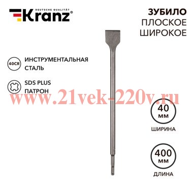 Зубило плоское широкое, 14х40х400мм, SDS PLUS KRANZ Плоское зубило с широкой рабочей поверхностью предназначено для демонтажа и дробления твердых материалов: камня, бетона, кирпича, плитки, штукатурки. Зубило выполнено из сверхпрочной инструментальной стали, легированной хромом и молибденом (40Cr), благодаря чему имеет долгий срок службы. Изготовлено методом ковки, что повышает прочность и устойчивость оснастки к механическим воздействиям, а также минимизирует количество дефектов материала. Оптимальная заточка лопатки гарантирует высокую производительность и качество выполнения работы. Увеличенная рабочая часть легко справляется с обработкой широких поверхностей. Зубило имеет улучшенную форму для эффективного отвода пыли и мусора. Хвостовик стандарта SDS-plus диаметром 14 мм быстро и надежно крепится в легких строительных перфораторах с соответствующим патроном. Используется в ударном режиме.