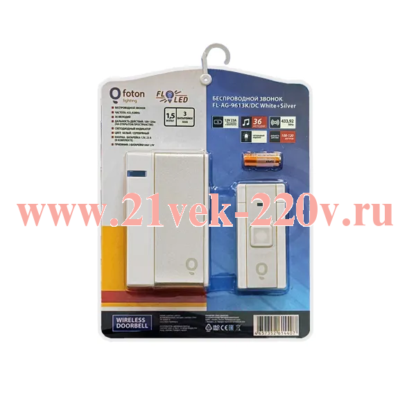 Звонок беспроводной FOTON FL- AG-9613K/DC 3x1.5V(AAA) с 36 мелодиями и 3 уровнями громкости звука.